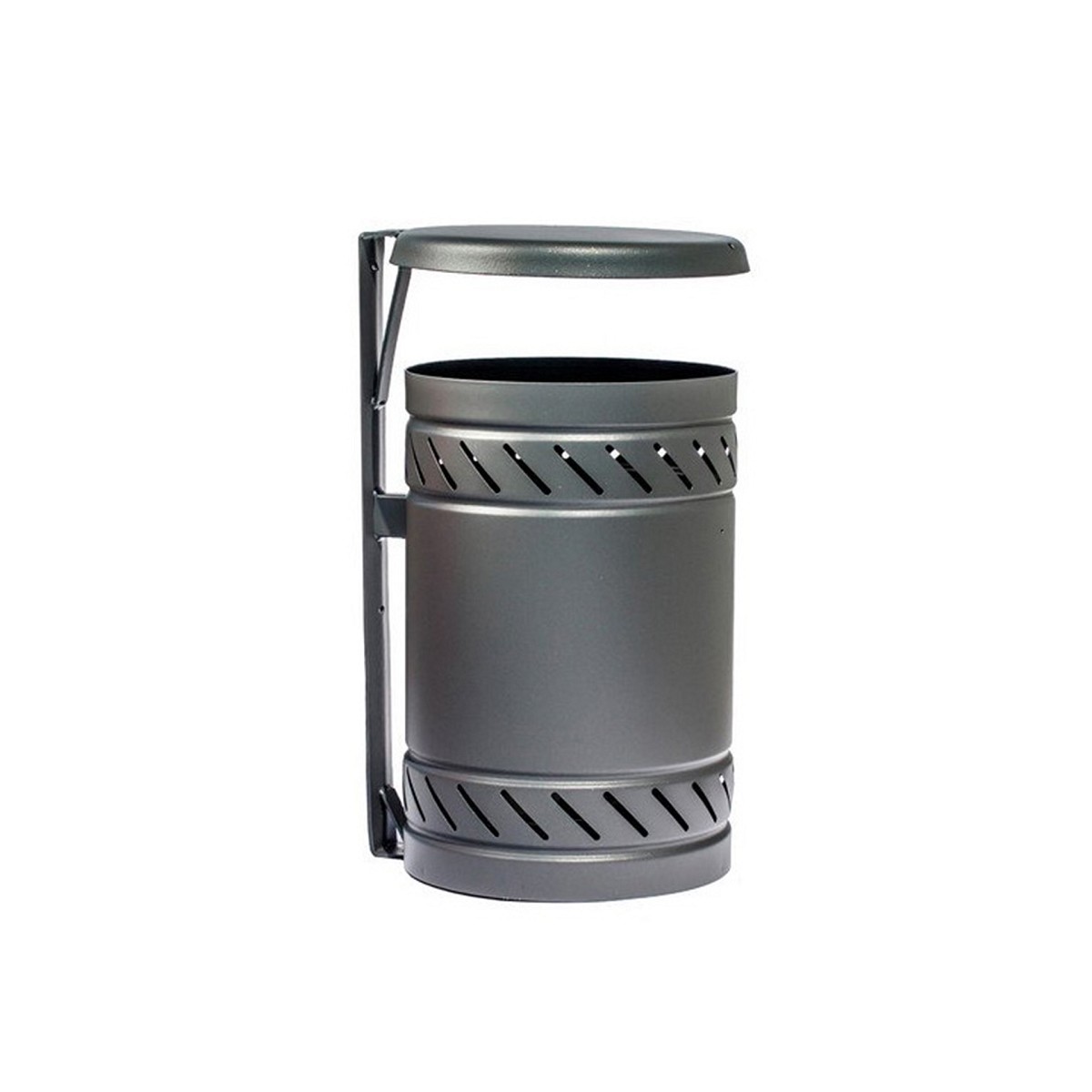 Cestino portarifiuti, capacità 32 litri ca., con o senza coperchio, in lamiera zincata Sendzimir punzonata e calandrata; estremità superiore ribordata e fondello forato per ventilazione ed eventuale scarico acque. Fissaggio possibile a qualsiasi parete o palo, dispositivo meccanico di chiusura, sostegno in tubo di acciaio Ø60 mm, con eventuale piedistallo in calcestruzzo, flangiato o da inghisare direttamente al suolo.